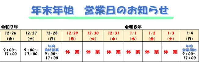 年末年始休業日:2025年12月29日(月)〜 2026年1月3日(土)
